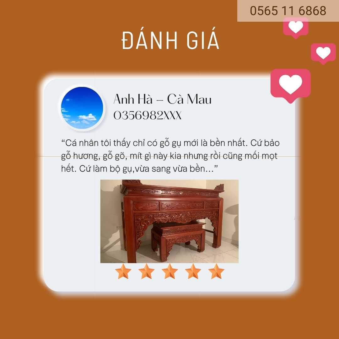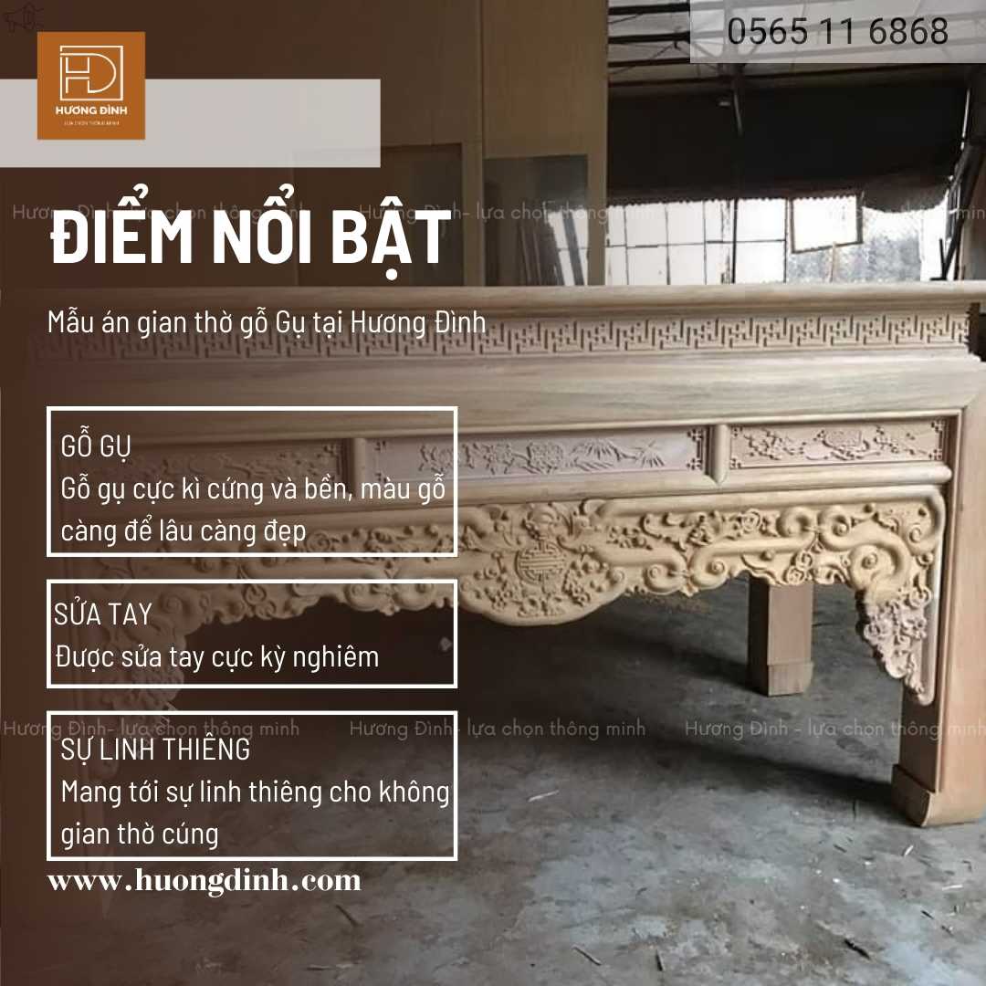 bàn thờ làm từ gỗ gụ có màu nâu nhạt. Trên phần dạ của bàn thờ có chữ Thọ bằng chữ Hán. Bên trái của bức ảnh là ghi chú về điểm nổi bật của sản phẩm
